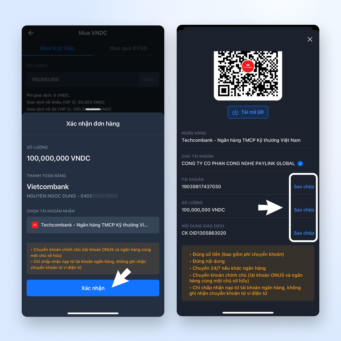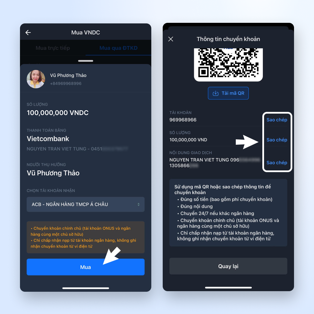 • Với các đơn mua VNDC không chính chủ, ONUS sẽ không hỗ trợ khớp đơn. Nếu bạn vô tình tạo đơn Mua VNDC không chính chủ, vui lòng liên hệ phía ngân hàng/ ví điện tử để yêu cầu hoàn trả.