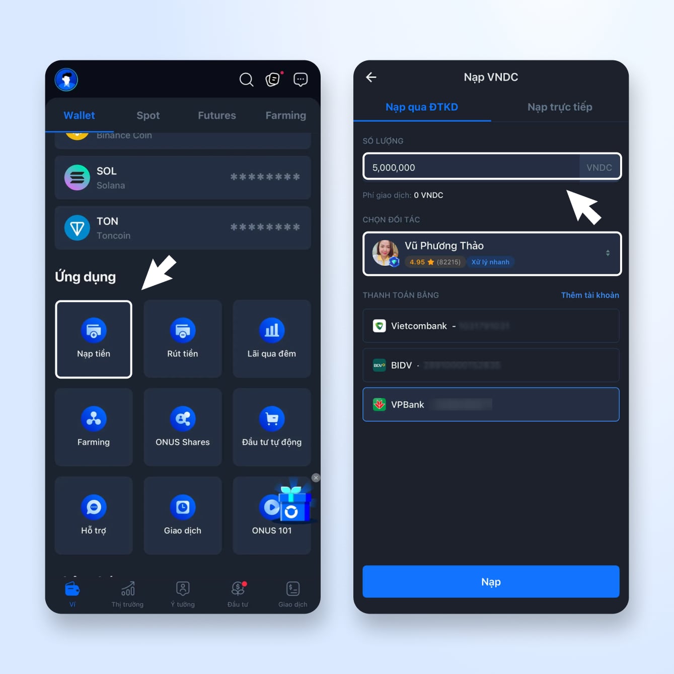 Bạn có thể nạp tiền vào ứng dụng ONUS bằng 1 trong 2 cách: